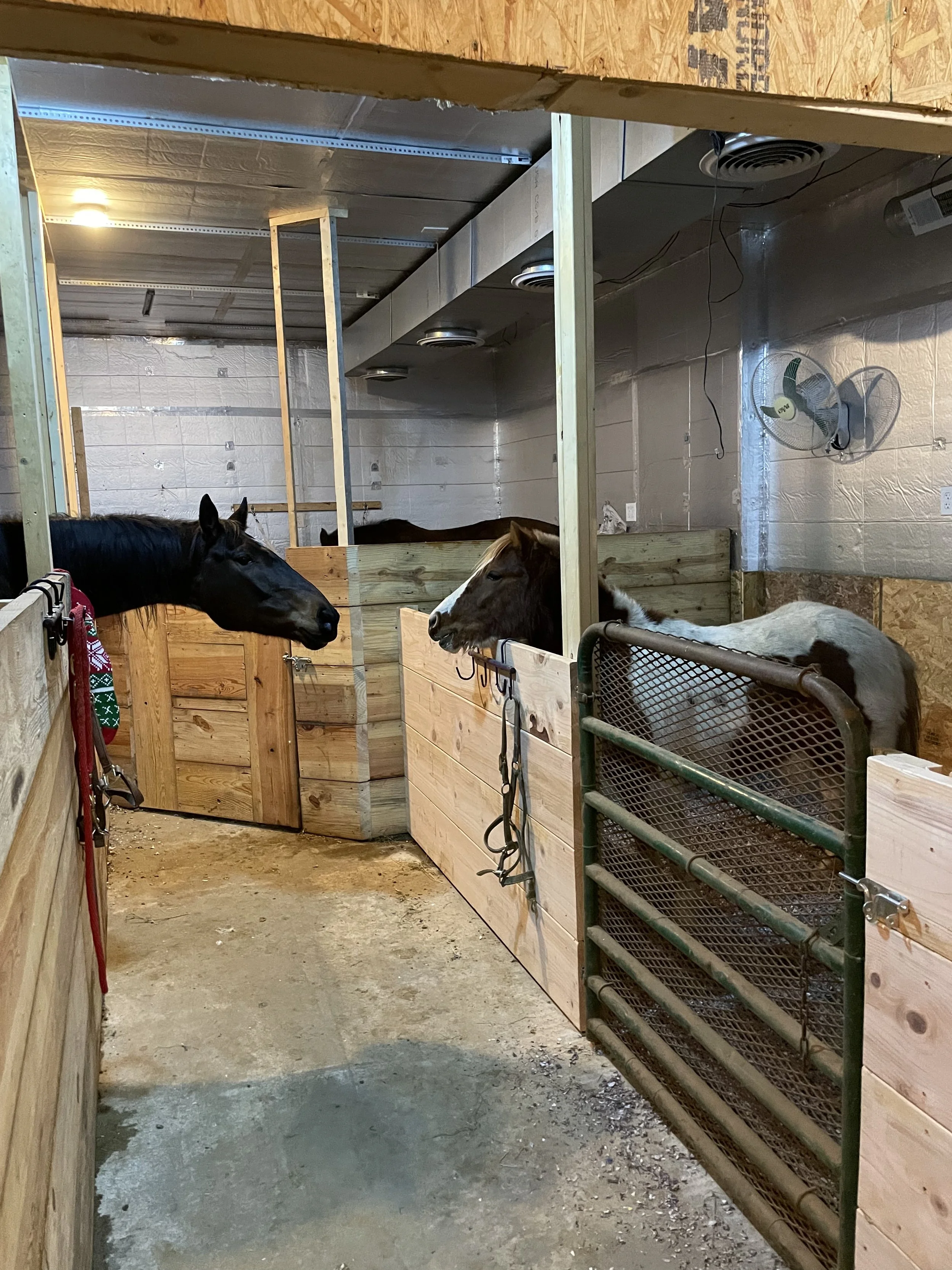 Stalls are 12 x 12, matted and cleaned daily. Each stall has 2 water buckets and a hay net.